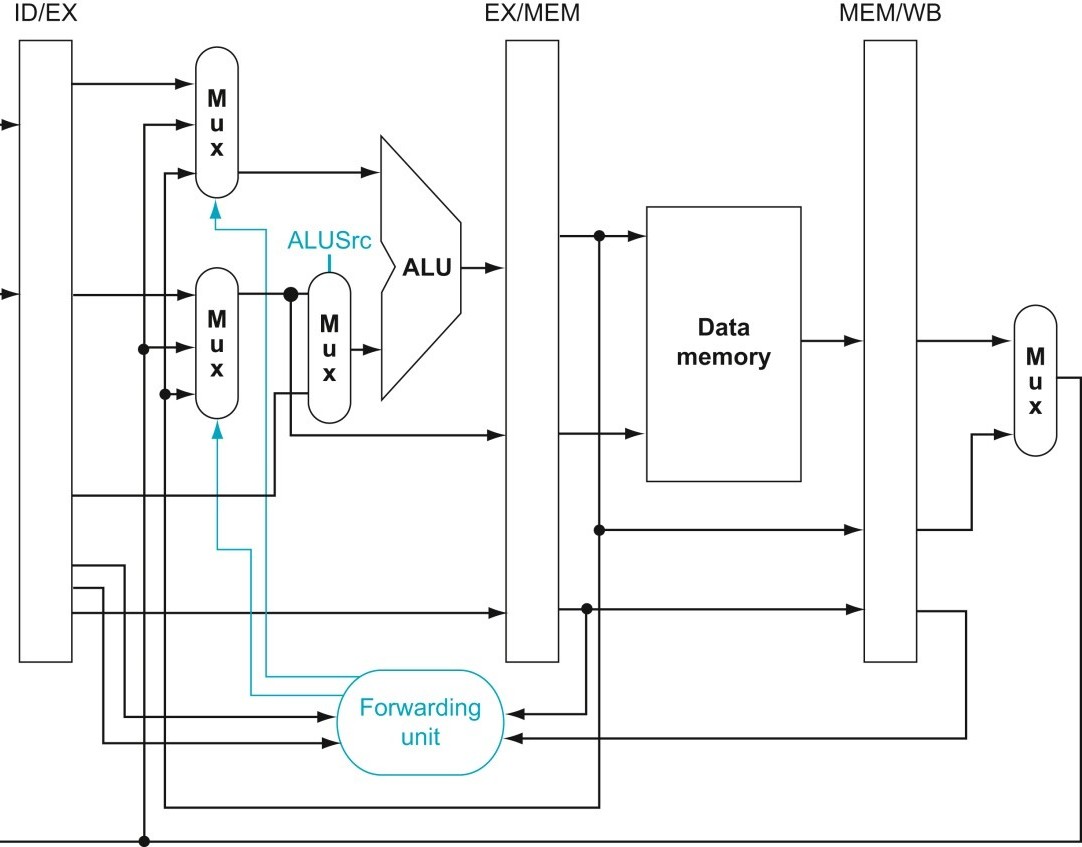 • SUGGESTION: connect some outputs from the MEM_WB pipeline stage register and from the ID_EX pipeline stage register to determine whether the hazard exists, then create an output that will control a mux to use forwarded data (from MEM_WB) or the standard data from the EX cycle.