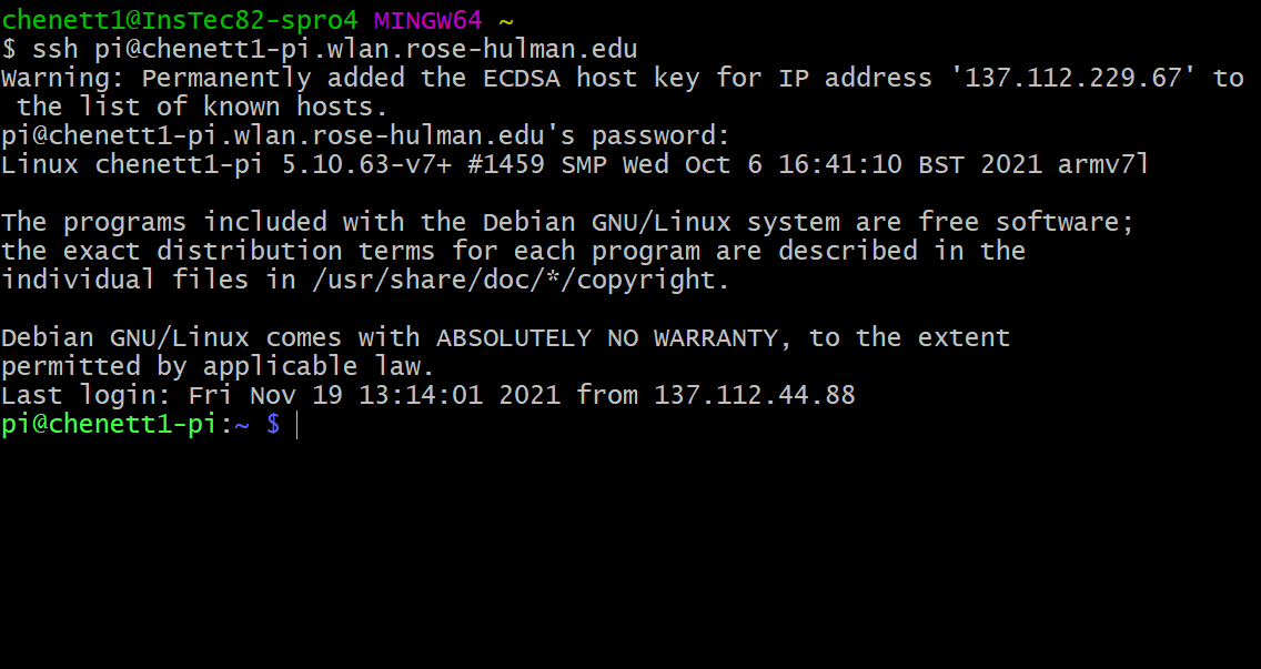 piand you'll use default passwordraspberry(unless you've already changed the password in the setup step). Also remember that your Pi's hostname is<rhit username>-pi, and it's connected through the RHIT WiFi, so the complete network address is<rhit username>-pi.wlan.rose-hulman.edu. For example, in Git Bash, you can use the commandssh pi@<rhit-username>-pi.wlan.rose-hulman.eduYou may be asked to add an ECDSA signature key, if so, say yes. If the SSH command complains that the key differs from a known key (say, after re-installing Raspbian), use the command