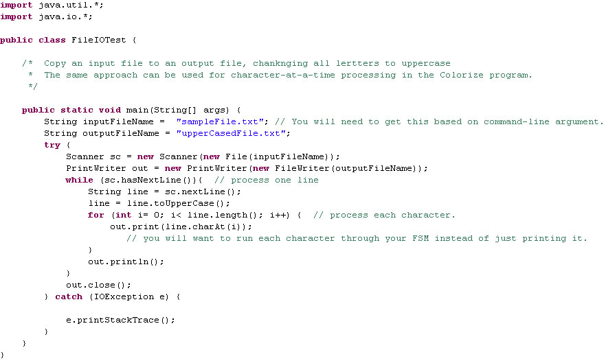I suggest developing and enhancing this program incrementally, doing the most basic and easiest parts first. First, plan your program framework (mainly this means implementing a basic FSM) and get colorized comments working. Then add new FSM states for colorizing strings. Finally, add the mechanism for recognizing and colorizing keywords. Most of the correctness credit will be for colorizing comments and strings. Including colorized keywords is more difficult; can you see why?