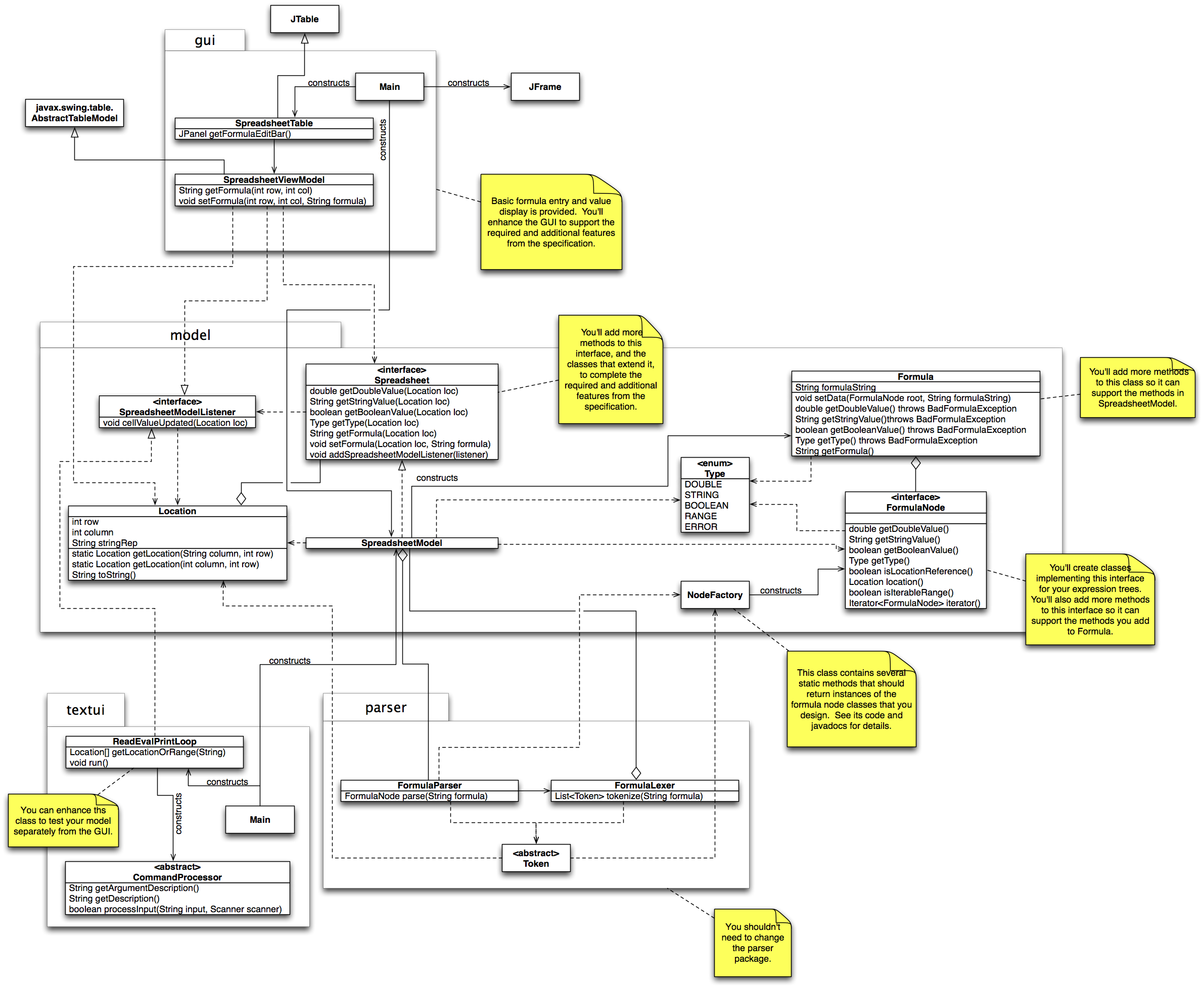 This is a team assignment. My intention is not that you “divide and conquer” as much as that you have people to talk with as you write and test this program. Most teams will have four members. A reasonable approach is to work in pairs. You might begin with two people working on the GUI and two on the spreadsheet data structures. Then you could mix the pairs so that each pair has a GUI person and a data structure person.