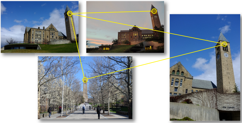 The next step of processing is to match keypoints across different views. We call a set of keypoints that all refer to the same 3D point a “track”. Here’s a conceptual view of what we’re trying to compute next: we’ve matched the same 3D point across multiple views. We know the pixel locations of this one point as it appears in each image.