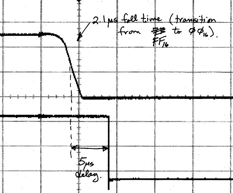 The 74HC14 hex Schmitt trigger is used between the op amp and the digital controller to ensure that the digital controller sees a clean high or low signal. When the op amp inputs become very similar (say, to within tens of microvolts), then the op amp output will not be a solid high or low voltage. The Schmitt trigger uses hysteresis to ensure that intermediate voltages get sent to either ground or Vcc. The op amp and Schmitt trigger will be collectively referred to as the "analog comparator." The MC1408 digital-to-analog converter (DAC) accepts an 8-bit digital number as input and generates a proportional analog current as output. The current is converted to a voltage by the op amp current-to-voltage converter. The device can be used as a 7-bit converter by tying the LSB low and using the upper seven bits. For example, applying 7'b0000000 will generate zero volts, applying 7'b1000000 will generate 2.5 volts, and applying 7'b1111111 will generate 5 volts. You should account for the delay associated with the DAC and analog comparator. The DAC has a measured fall time of 2.1 microseconds when the digital input transitions from FF (full scale) to 00 (zero). The analog comparator has a measured delay of 5 microseconds from input to output. Consequently, your digital system must apply input values to the DAC at a slow enough rate to assure that the analog system settles to a stable value before the digital system samples the output of the analog comparator. The measured waveforms for the preceding discussion are shown below (the top trace is the output of the DAC, and the bottom trace is the output of the comparator that is connected to the DAC): XS-40 BoardThe XS-40 board is to be used in an "FPGA-only" mode in this project. Since you will connect your own hardware to the FPGA, you need to ensure that the pre-wired microcontroller and SRAM devices do not interfere with your analog hardware. You can accomplish this by adding two outputs to your digital system, one to hold the microcontroller reset pin in the high state (this causes all of the microcontroller pins to enter the "hi-Z" or high impedance state), and another to hold the SRAM output enable in the high state (this ensures that the SRAM outputs remain in the hi-Z state).