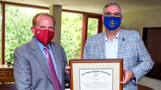 President Rob Coons presented an honorary doctorate of humane letters to Indiana Gov. Eric Holcomb during a campus visit Aug. 13. The degree was originally presented May 30 during the institute’s virtual Commencement.