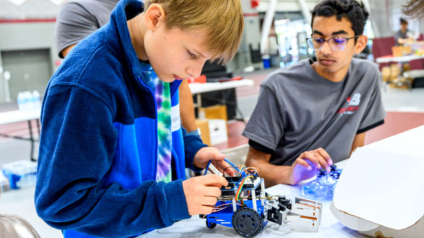 Student teams started their engines with pizza and event T-shirts before programming and wiring robots to simulate several aspects of racing.
