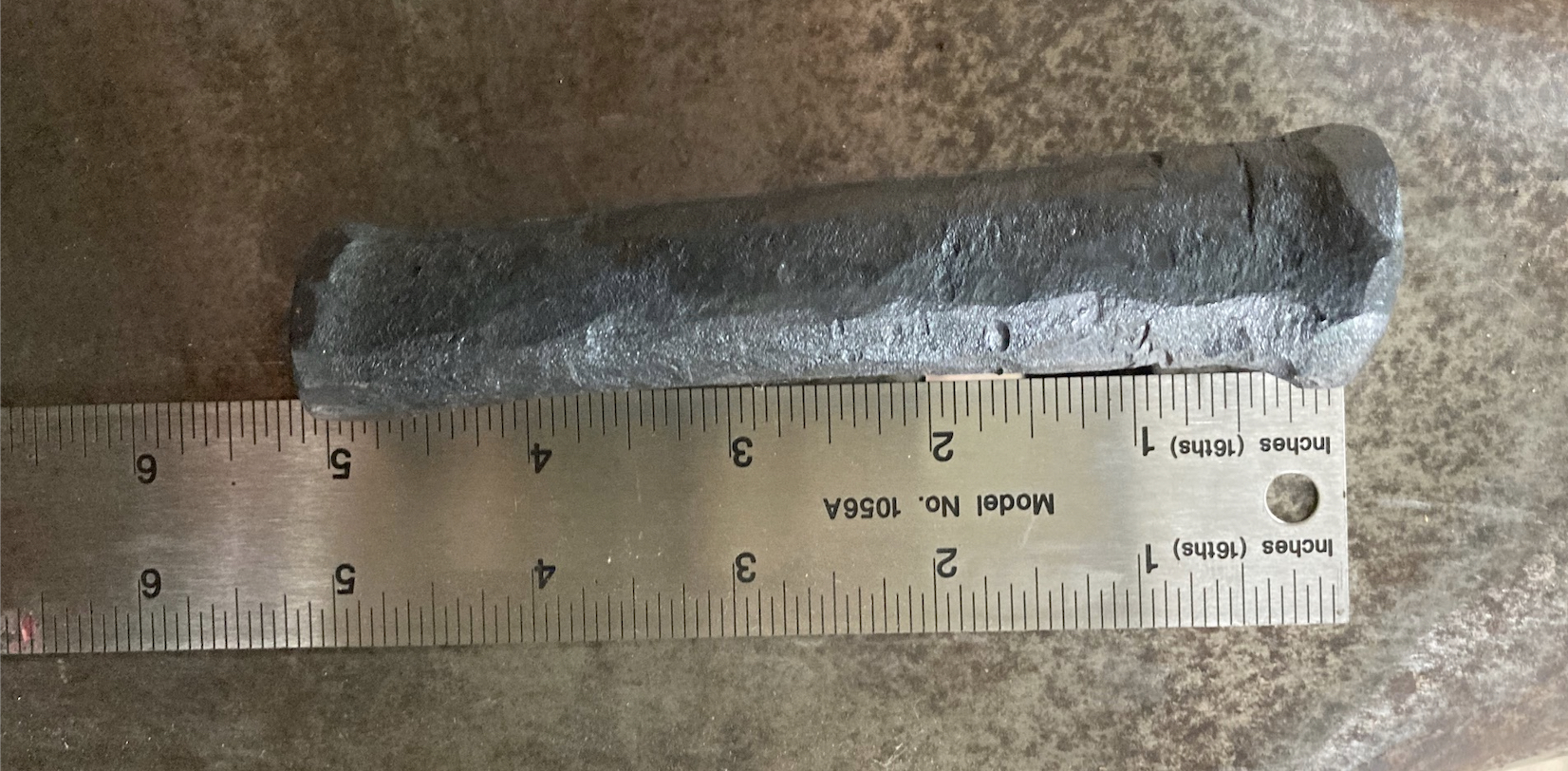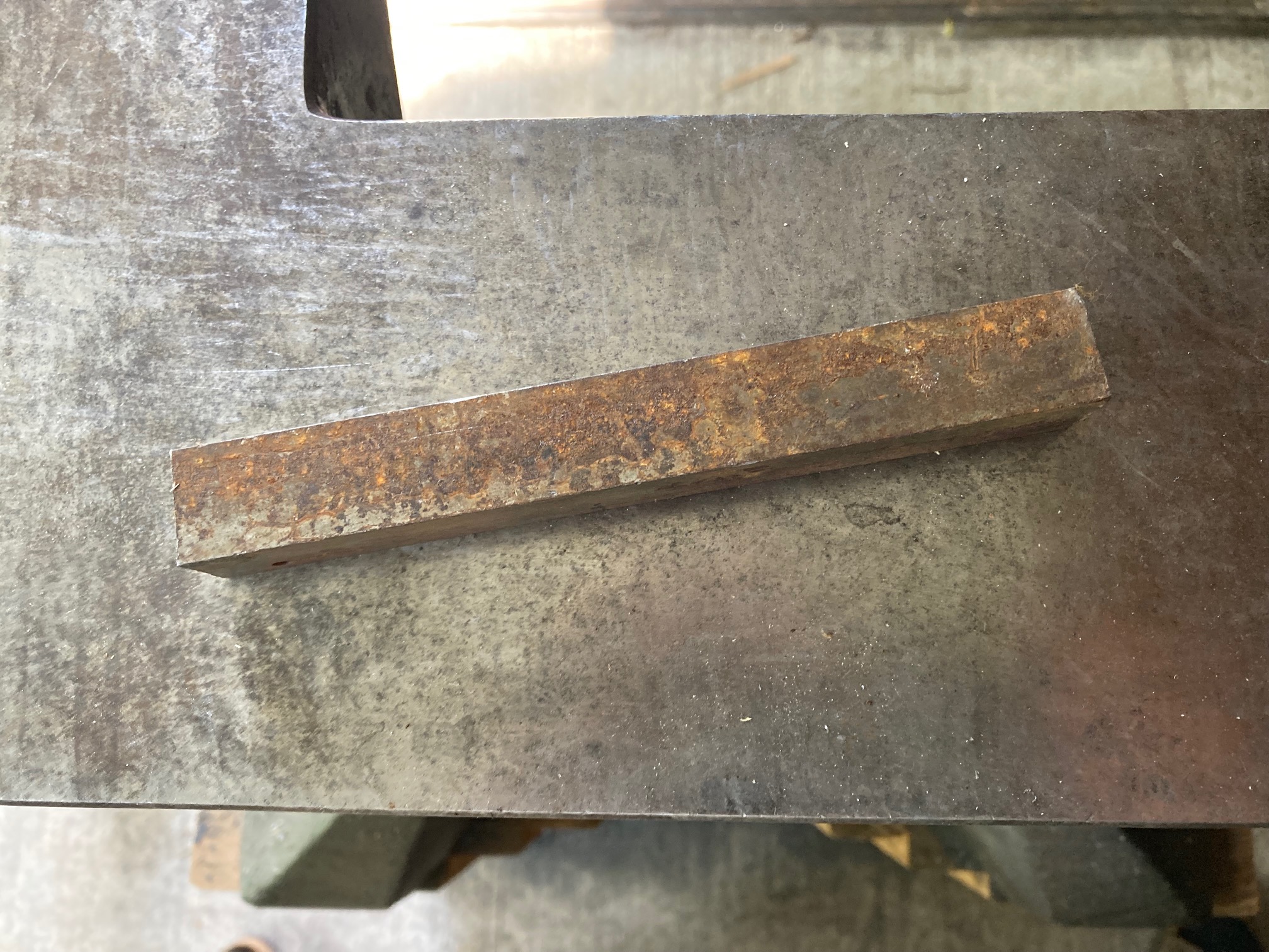The 150MM challange was issued by Ambrose Burne of the Hereford College of Arts, Hereford, UK, as an exercise in imagination in 2017. He gave his students a piece of steel, measuring 150mm x 20mm x 20mm and asked them to make something with it. I started with a 6" by 3/4" square piece:I began by rounding the piece and upsetting one side, on purpose while not minding that the other side was somewhat upset too. The length of the upset piece was now 5":
