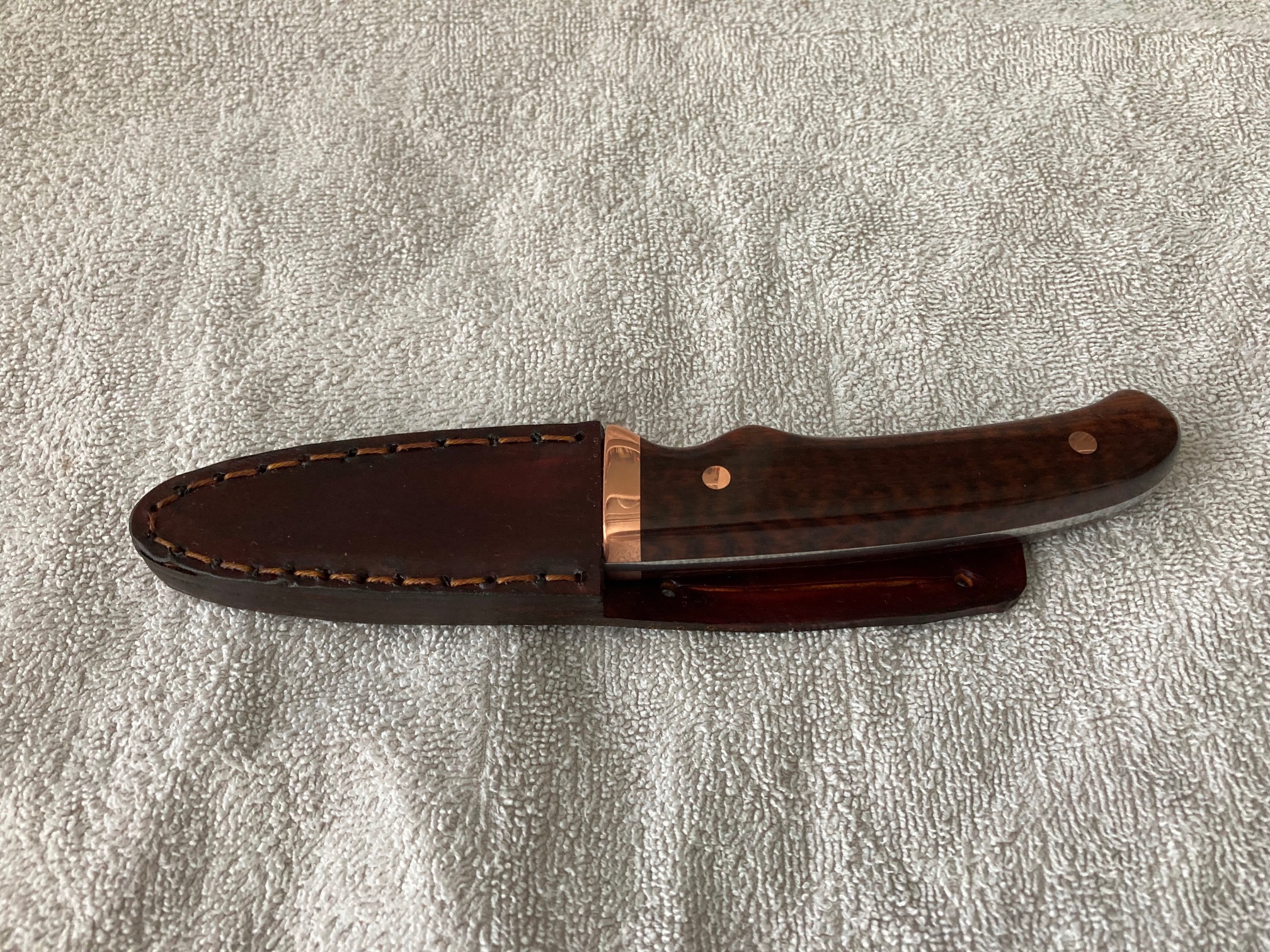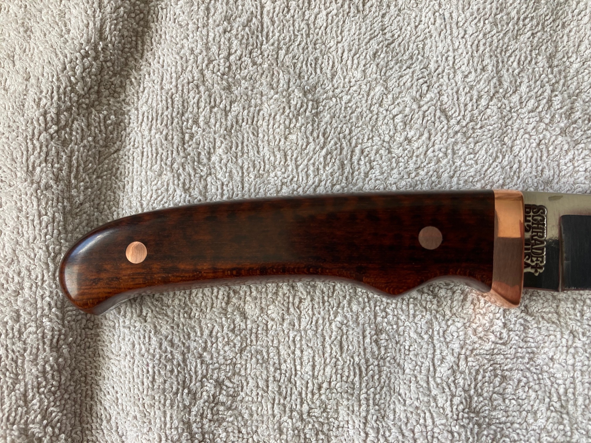 I modified this Special Edition knife made by Schrade. It came with an uninspiring guard and scales. I replaced them with a wider copper guard and wood scales. Unfortunaetly, I do not know what type of wood it is.