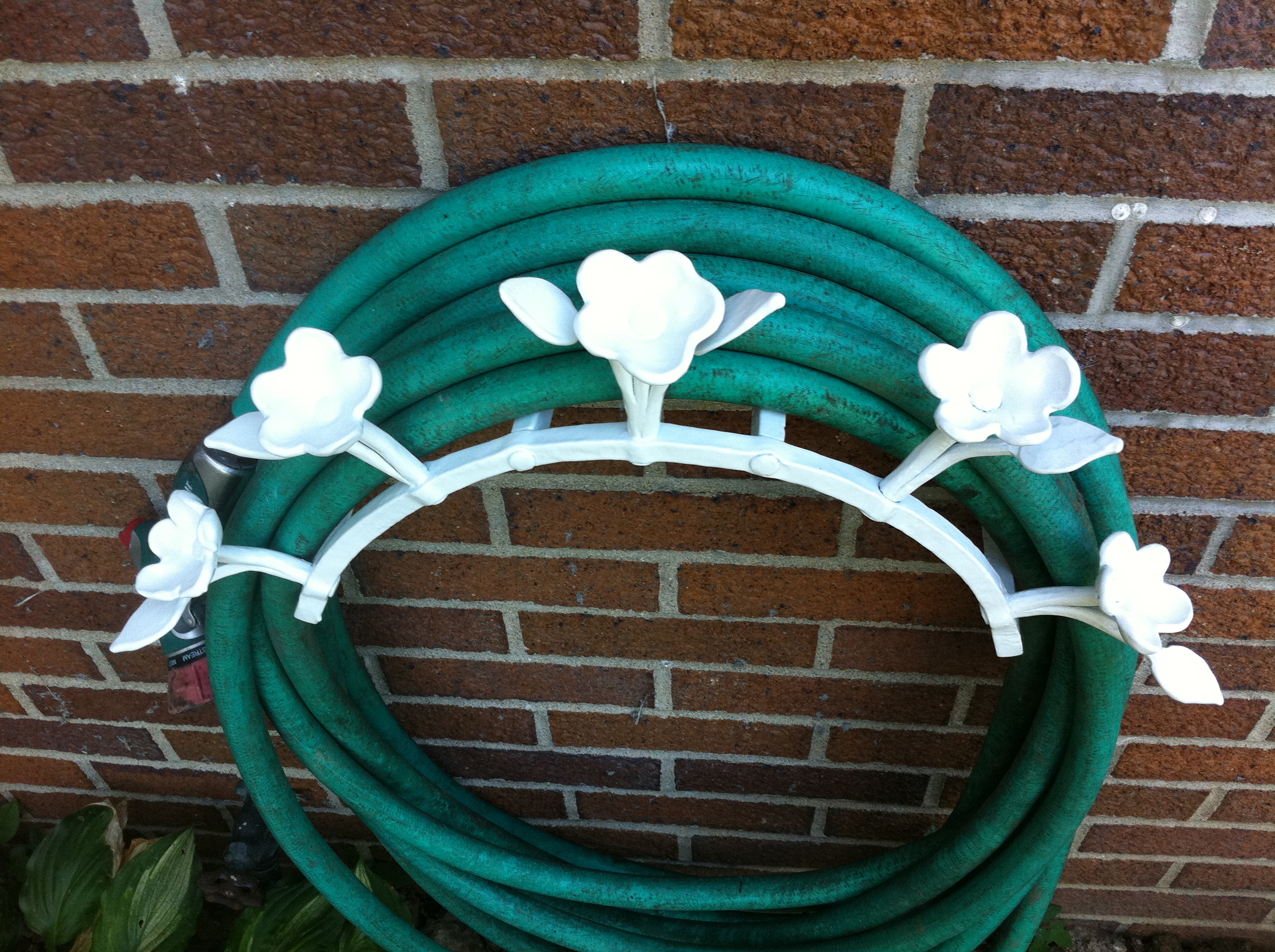 I forged this hose reel with classic forge welds, mortise and tennon construction and punches to define the petals. It is powder coated to prolong the life of the finish.