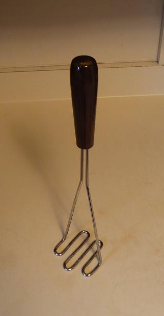 This potato masher is made from food grade stainless steel. I hot-bent the steel and then removed the scale in vinegar and sanded and polished the steel. I turned the walnut handle on my lathe and finished it with epoxy.This kind of masher makes the perfect mashed potatos, they need to have some small coarse pieces in them.