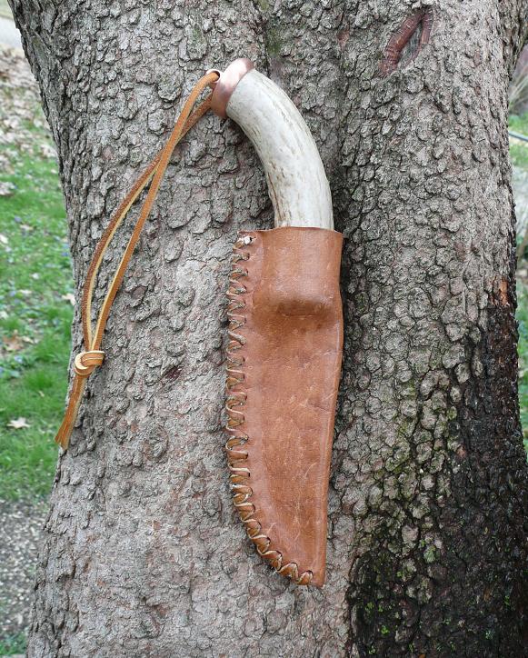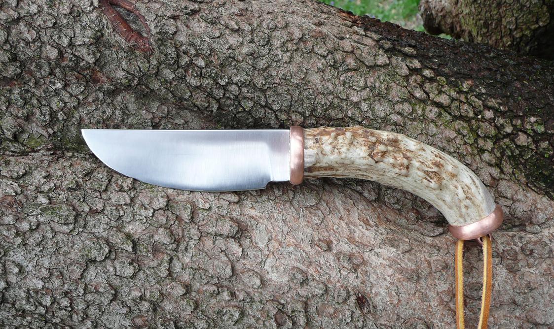 This is the fourth knife I built. It is a skinning knife with deer antler handle, copper guard and end. I sanded the knife up to 320 grit, so as not to polish it. I think it goes better with the style of knife. When I heat-treated the knife, I placed into engine oil with the back first. This created an ever so slight upward bend on the back of the knife. This was an accident but I rather much like the outcome.The sheath is made from cow hide. I just put it in warm water with baking soda and let it dry. I did treat it with some compound that prevents water from being absorbed.