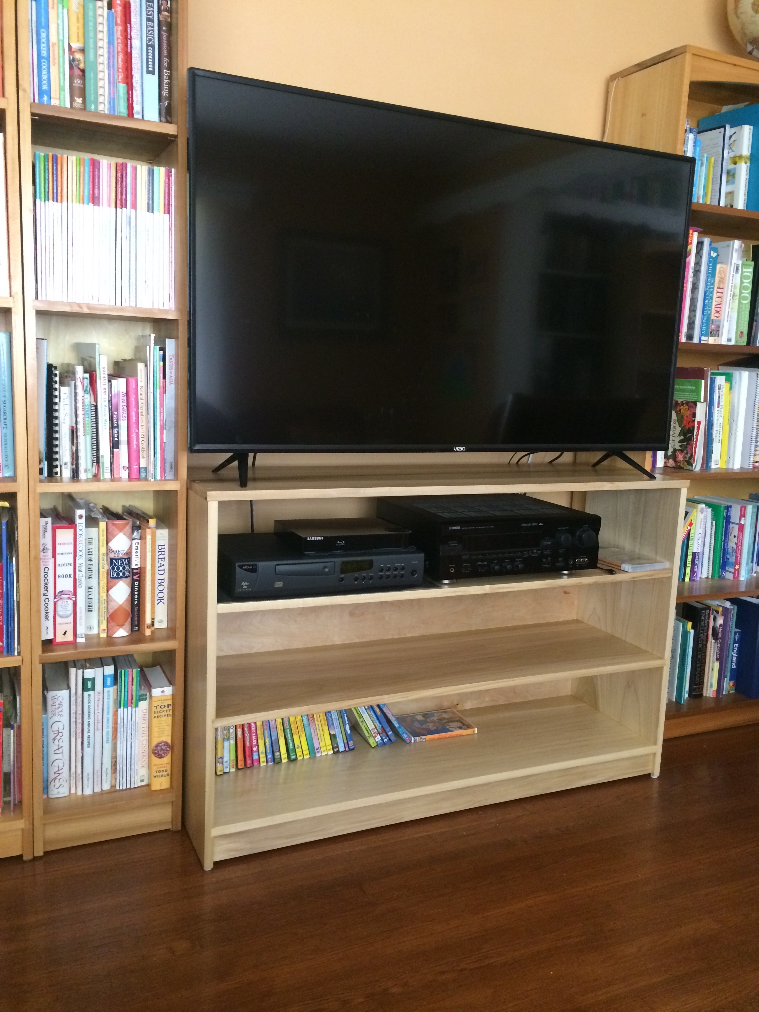 Our old TV busted, so we had to get a bigger one! This is a 4ft bookcase that is 14 1/2" deep so as to accomodate the stereo equipment. As such it stands out from the bookcases, giving the row of books cases some texture. The bookcase is made from poplar and clear coated with polyurethane. I took great pains in applying what I have learned over the year's to ensure fine workmanship on this stand.