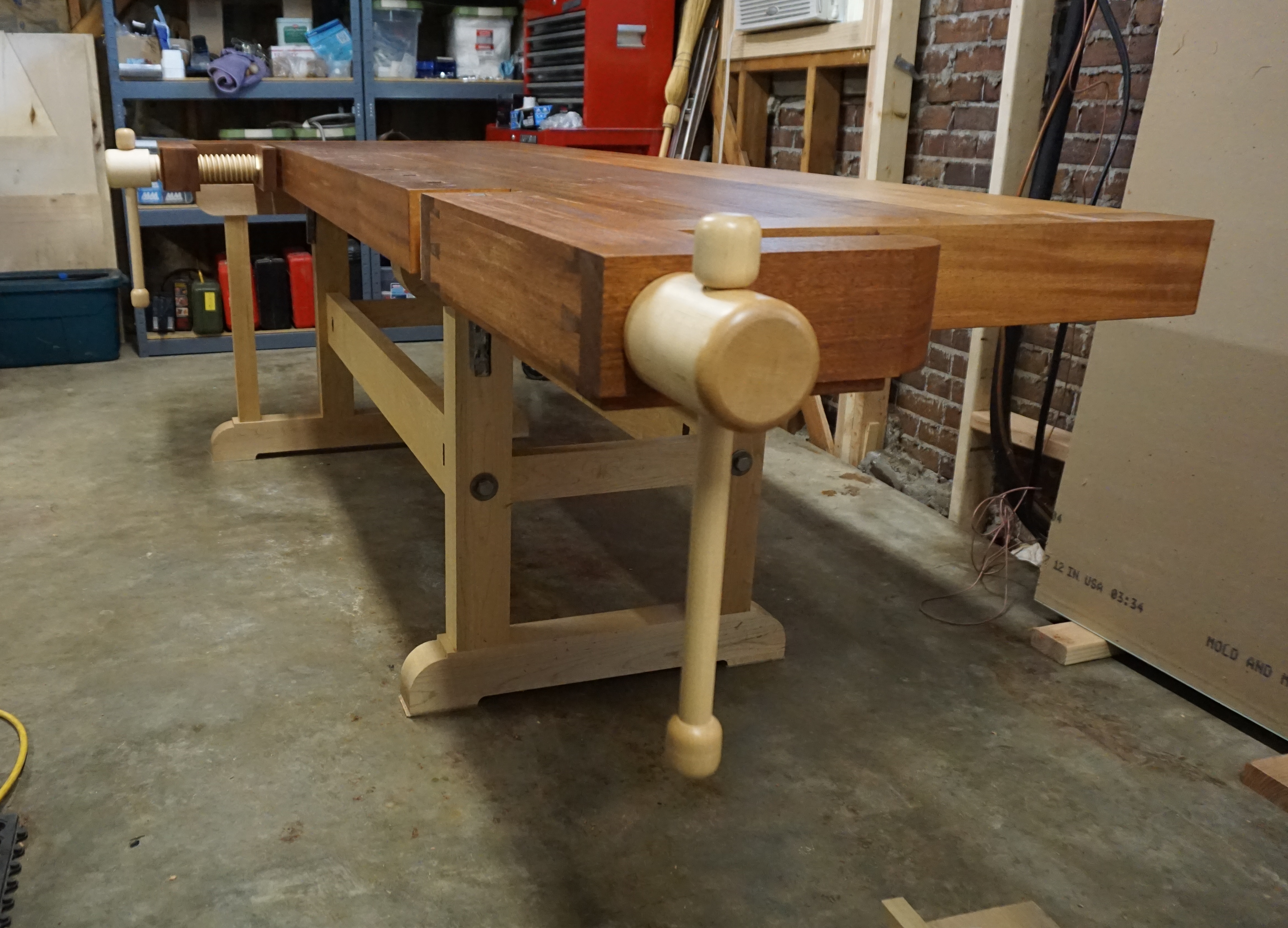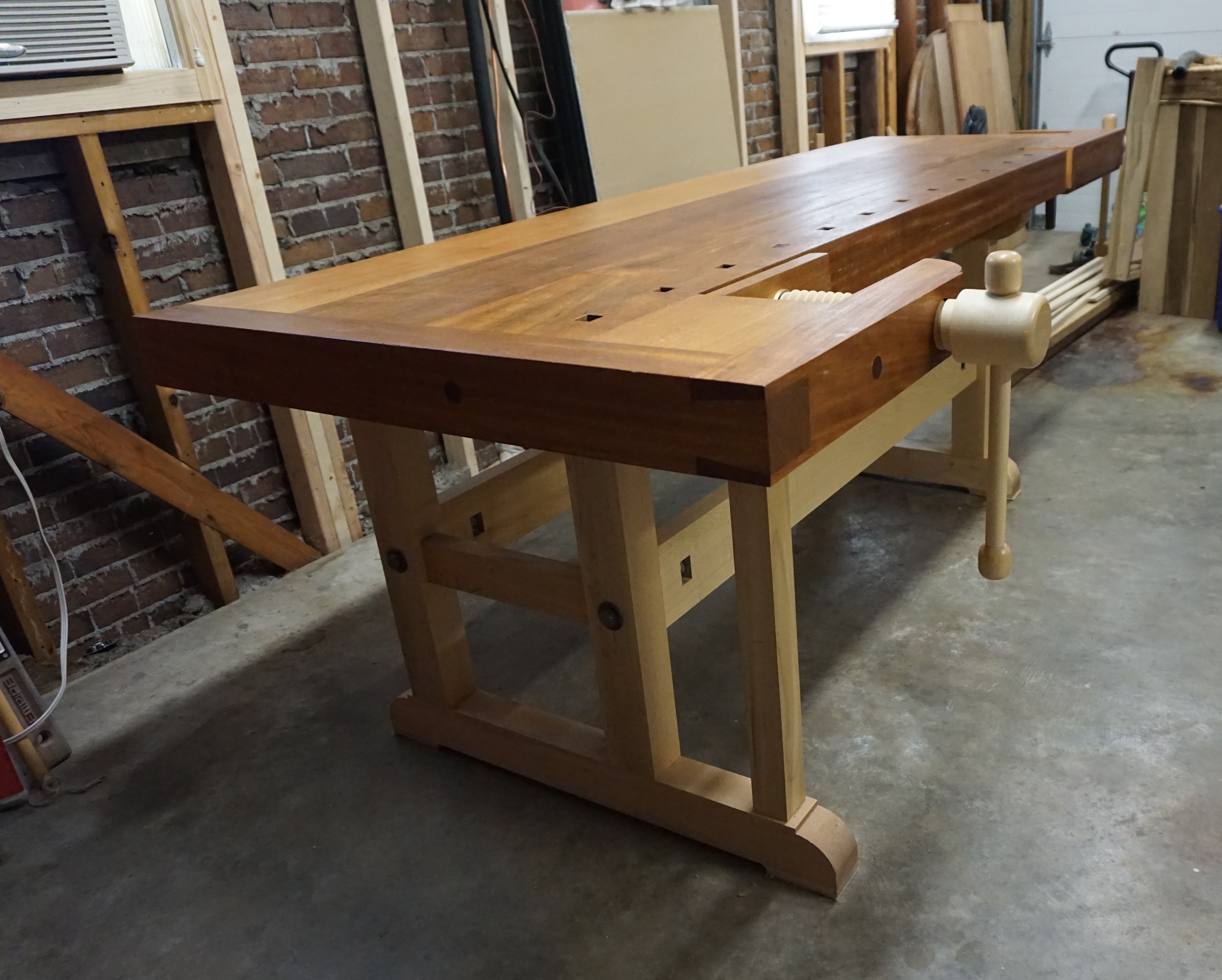 I love this workbench! It is a fine, beautiful tool that is a pleasure to use and inspires me to do my best work.This workbench is a cross between a traditional European workbench such as popularized by Frank Klausz [FWW issue 53 and in Scott Landis' book on The Workbench Book: A Craftsman's Guide to Workbenches for Every Type of Woodworking] and a Shaker workbench. The basic design is that of a European bench, with the recognizable shoulder vise and the 5th leg. However, the dimensions are a bit different, the core of this bench is 8' rather than 7' long and it is 30" rather than 26 3/4" wide. My bench does not have a tool tray, just as the Shaker benches do not have one. The reader should know that my first bench was made from a full sheet of plywood and I appreciated the space it afforded me. The support is pretty much the same as the Klausz bench, except that the stretchers are a slightly larger (1 1/2 by 5 1/2 and so are the bolts: 5/8 by 7".)